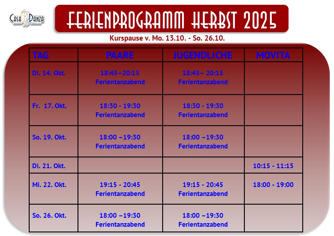 In der Zeit vom Montag 13.10. bis Sonntag 26.10. findet anstelle der Kurse das Ferienprogramm statt. Ab Dienstag 28.10. laufen alle Kurse wieder zu den bekannten Zeiten weiter.