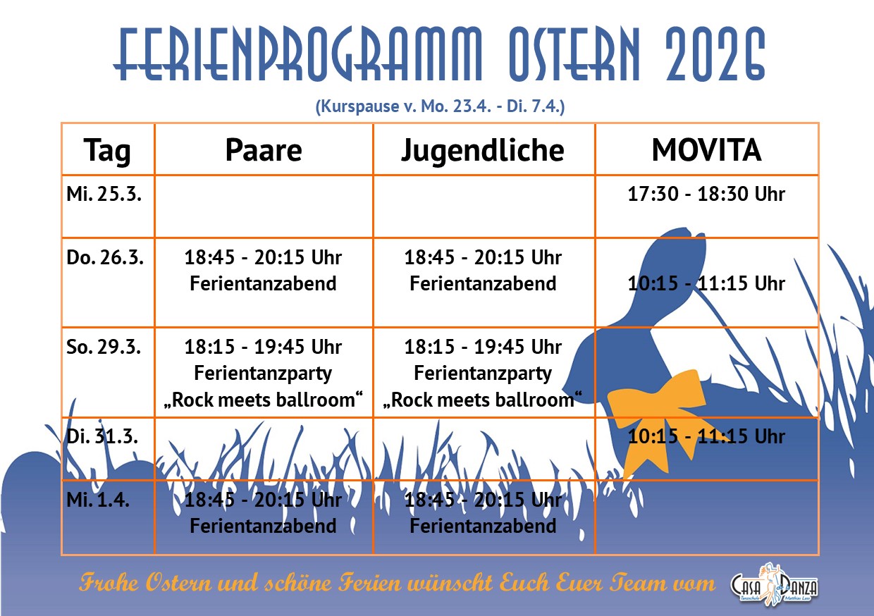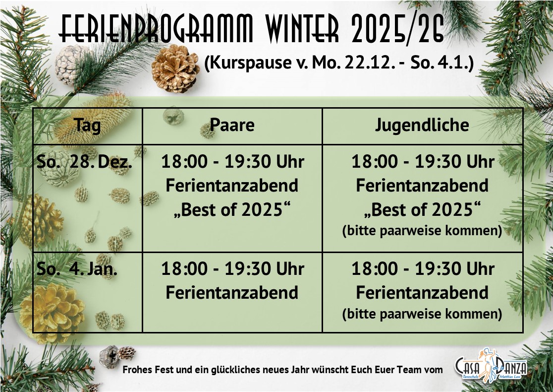 In der Zeit vom Montag 22.12 bis Sonntag 4.1. findet anstelle der Kurse das Ferienprogramm statt. Ab Dienstag 6.1. laufen alle Kurse wieder zu den bekannten Zeiten weiter.